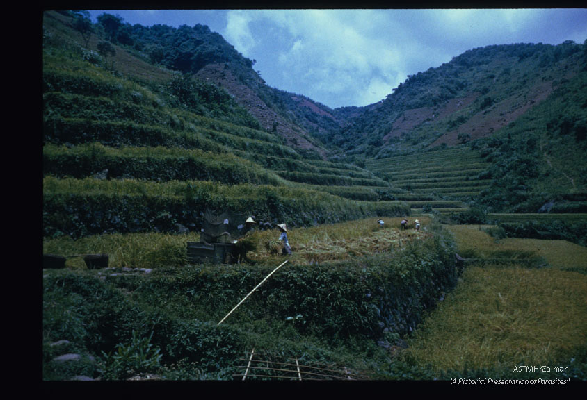 Description: Native farmers harvest rice just above the stream. When nature calls, they defecate in the fields. The feces are easily washed into the stream.