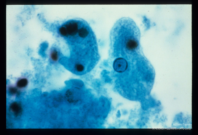 Mobile trophozoite showing nucleus and a single red blood cell.