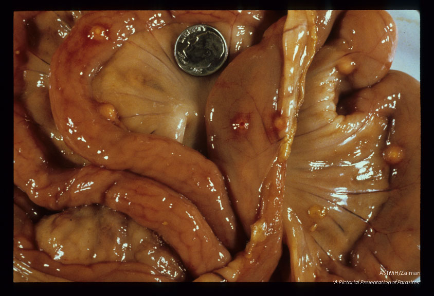 Gross view of opened hog abdomen showing multiple caseous nodules formed in response to worm attachment in the gut