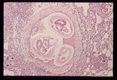 Onchocercoma extirpated from a young man in Liberia. On one side of the nodule is a cavity with many living worms. On the other side a stronger host reaction is present with a few worms embedded in the soft tissue. (Diameter 5 cm) Liberia.